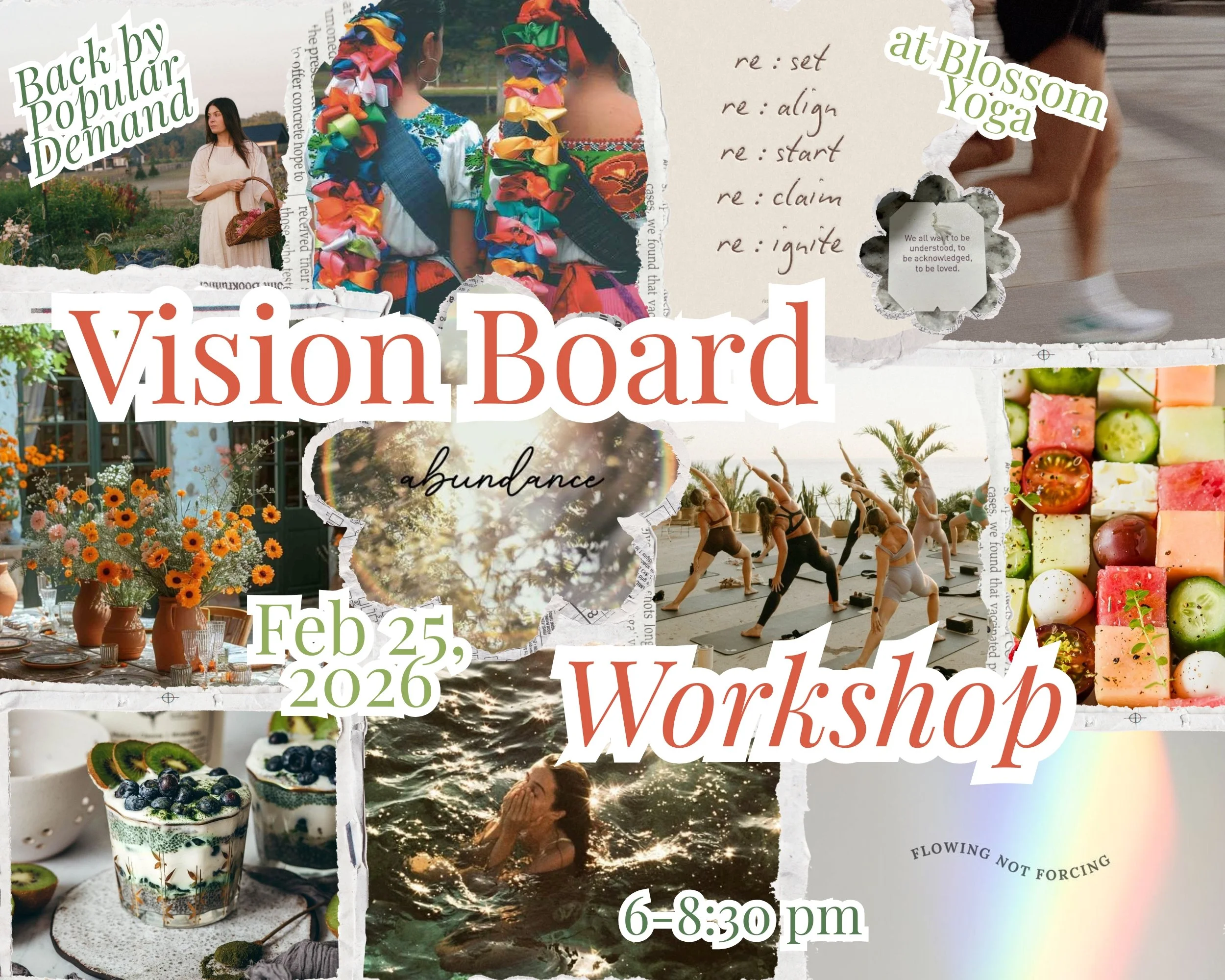 Please bring a yoga mat, water, and a journal, and wear comfortable clothing you can move in. We will provide all vision board materials. You are welcome to bring any additional pictures, clippings, quotes, or magazines to use on your vision board.